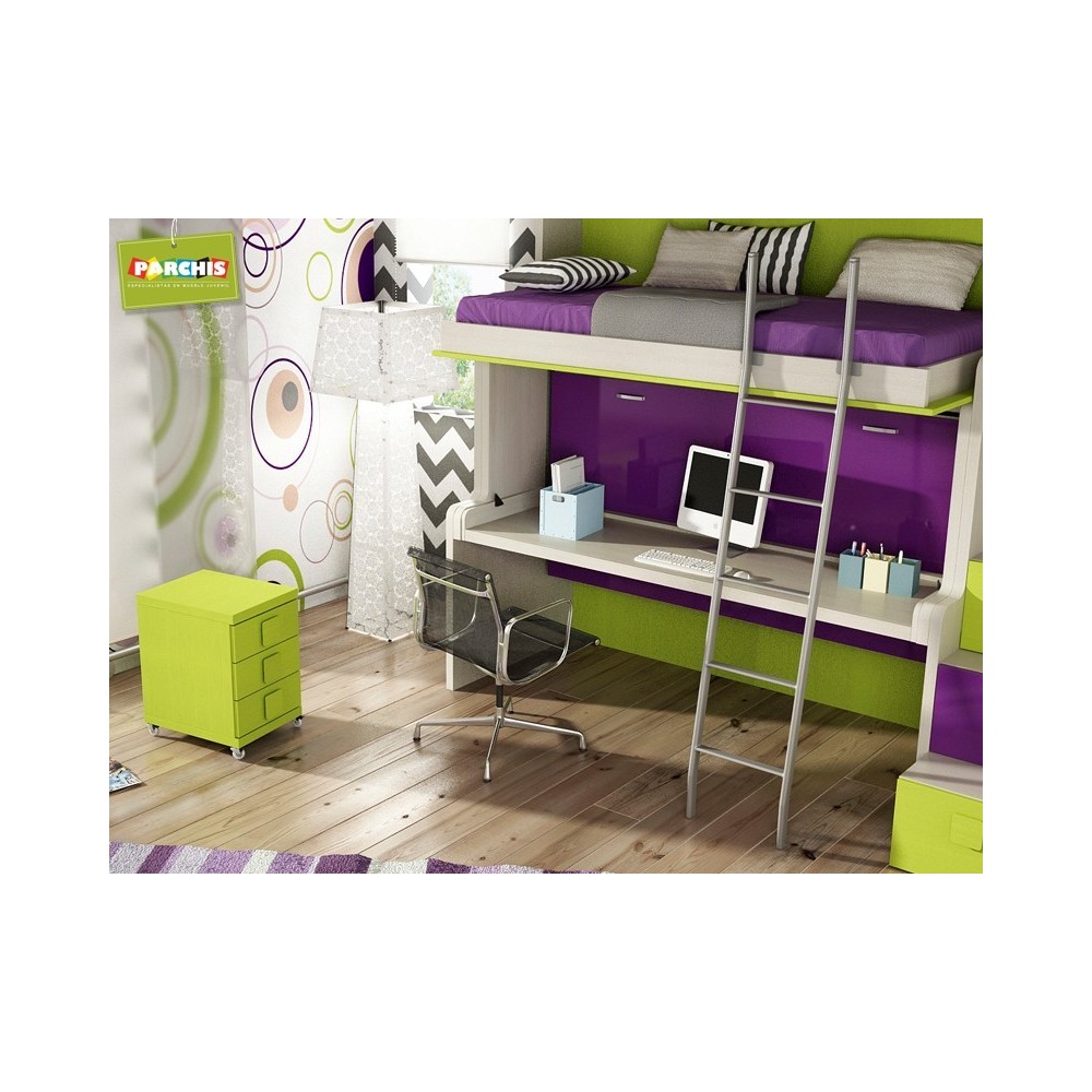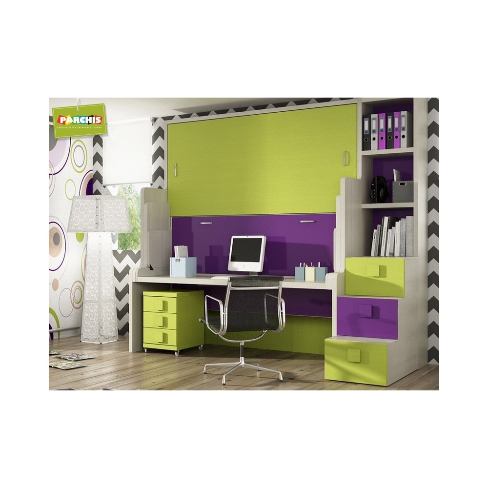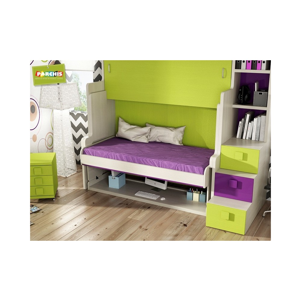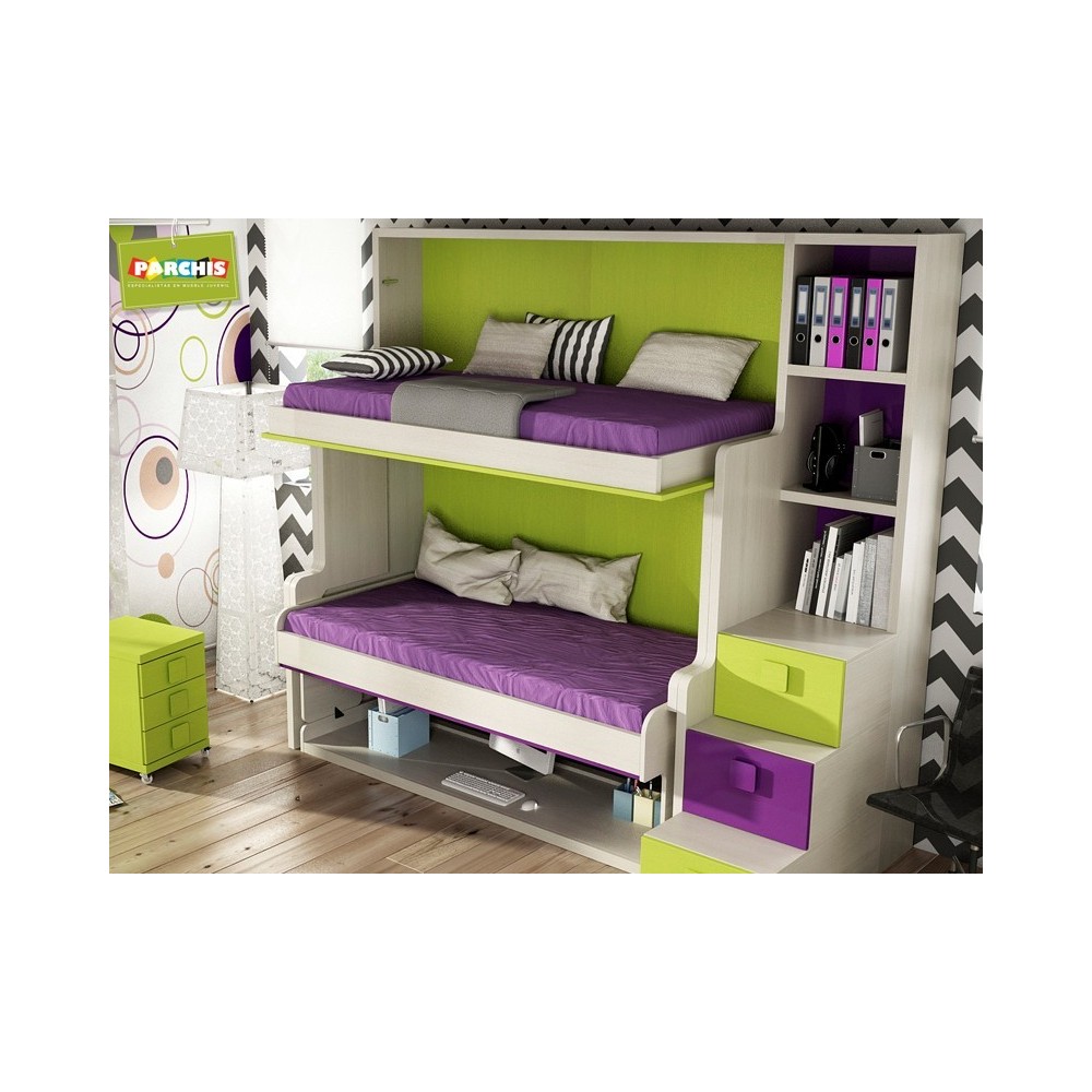 Arriba una cama alta plegable escondida a la pared, abajo una cama convertible en mesa. Ideal composición para habitaciones con paredes de pladur ya que no tiene tiro de pared y se sostienen por si sola. Es perfecta para compartir con niño y niña y tener ambientes diferenciados.