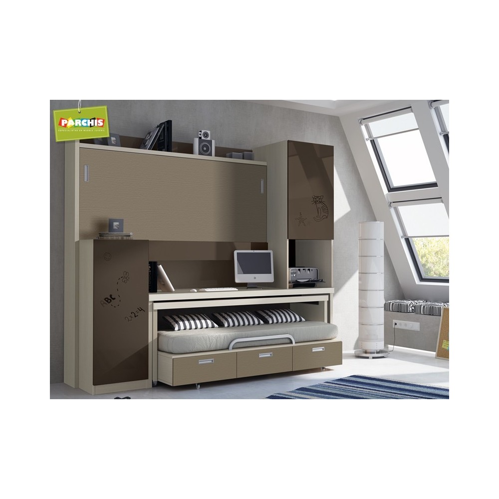 Una composición ideal para habitaciones juveniles, pequeñas donde necesitas poner dos camas y mesa para tus dos hijos.