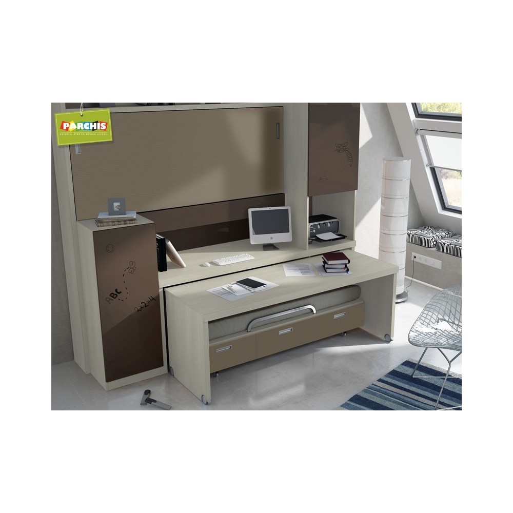 Este modelo de litera cuenta con cama alta abatible, cama baja con tres cajones, y una gran mesa de estudio para dos personas.