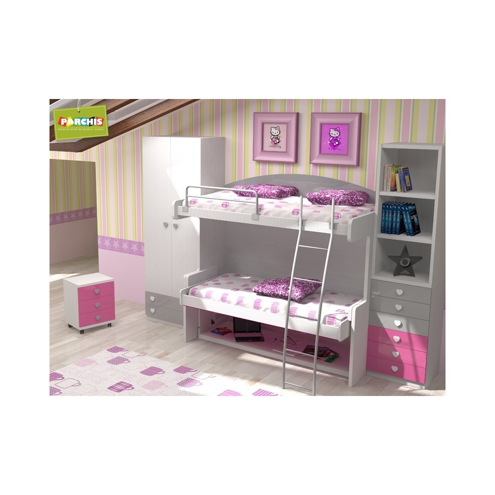 Increíble Dormitorio con un gran modelo de litera juvenil convertible en blanco y rosa.
