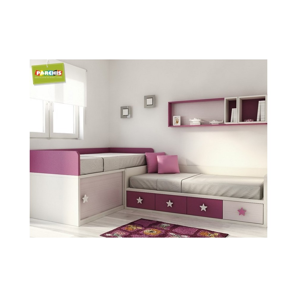 Literas camas tipo tren, cruzadas en forma de ele en el dormitorio Juvenil, con un total de dos camas.