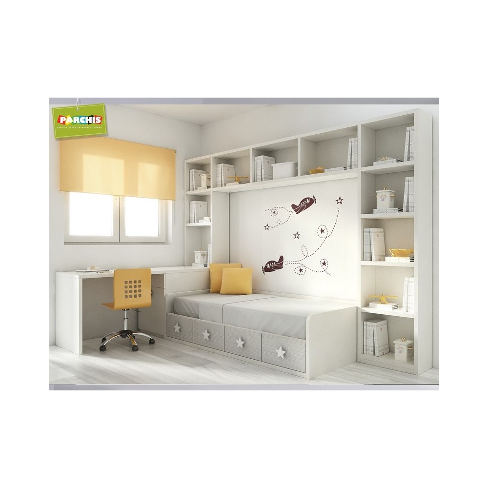 Habitacion infantil super practica con todo lo necesario para un futuro, una cama nido con cajones debajo, un frontal todo con librerias con estantes vistos, y una mesa de estuido super grande con bajos de cajones y un arcon zapatero extraible
