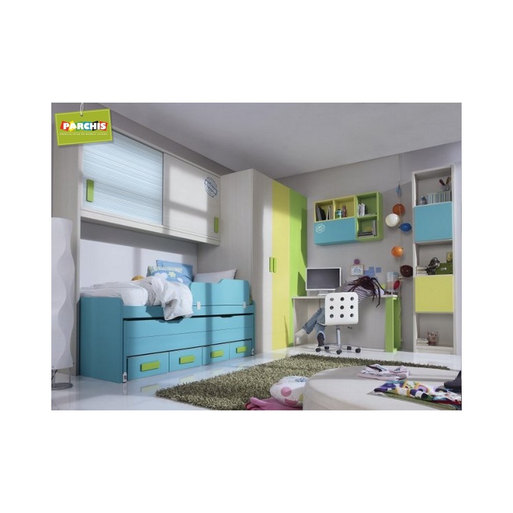El dormitorio esta en tonos alegres e infantiles en colores pastel como amarillo, azul, verde y blanco como base, completándolo con un gran armario de fondo compacta, de dos puertas y un nuevo diseño cuadrado con un gran interior.