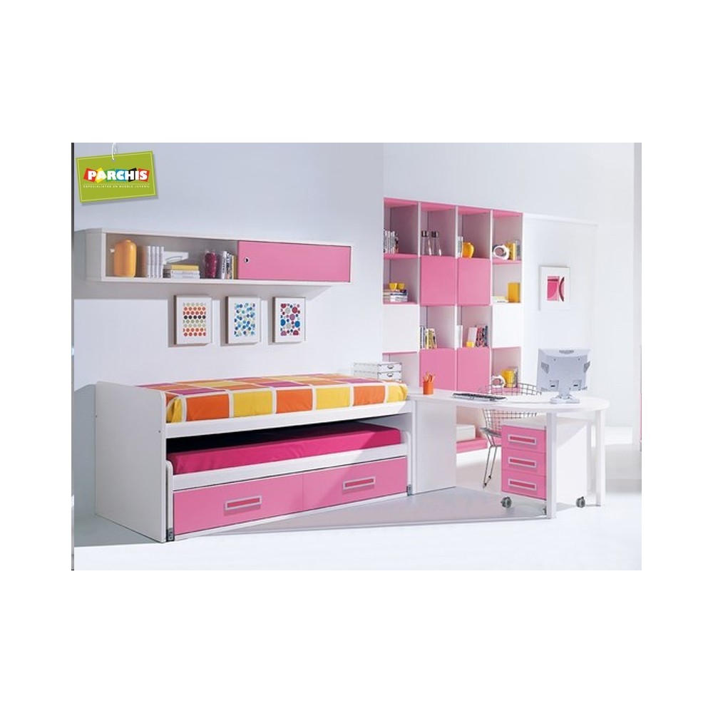 Para espacios amplios, con varias paredes que amueblar, una cama compacta con las dos camas vistas y cajones abajo, con un puente altillo de puerta corredera, todo esto más una zona de estudio a medida en una misma pared.