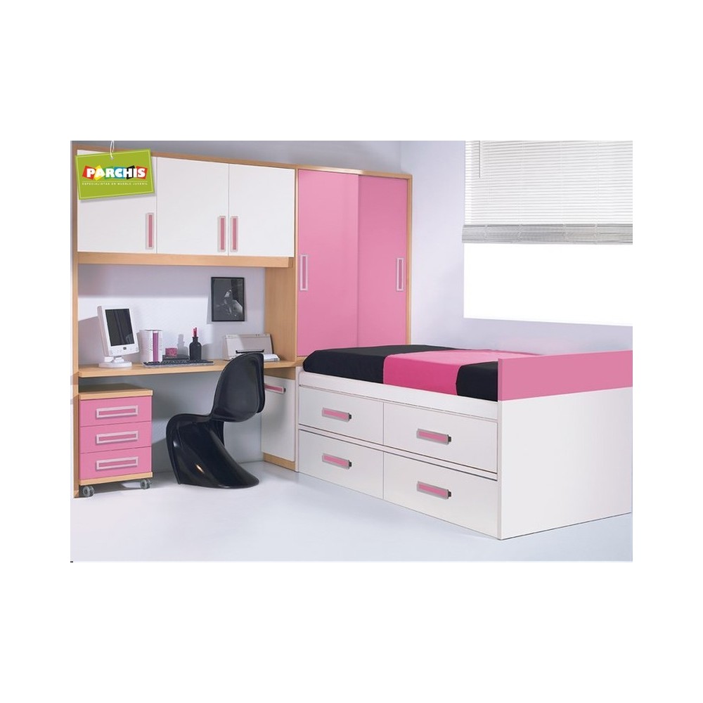 Mueble Juvenil con cama compacta con cuatro grandes cajones contenedores abajo, un mueble armario con dos puertas y arcón interior, y además a continuación una mesa grande con puente arriba todo puertas y bajo de cajones,