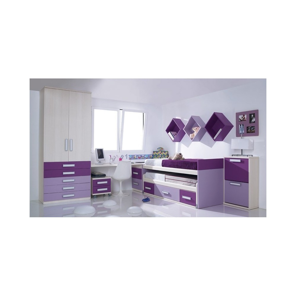 Habitación Juvenil para chica en Morados con camas compactas dobles. Tienda Muebles Madrid con mobiliario Juvenil moderno y actual.