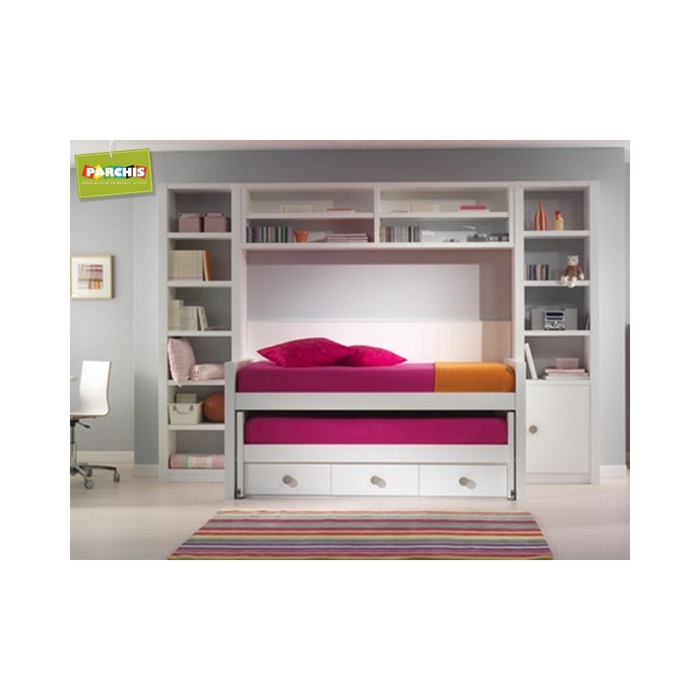 Con cama compacta de dos camas y tres cajones abajo. Puente alto diáfano, librerías haciendo forma de “u” alrededor de la cama.