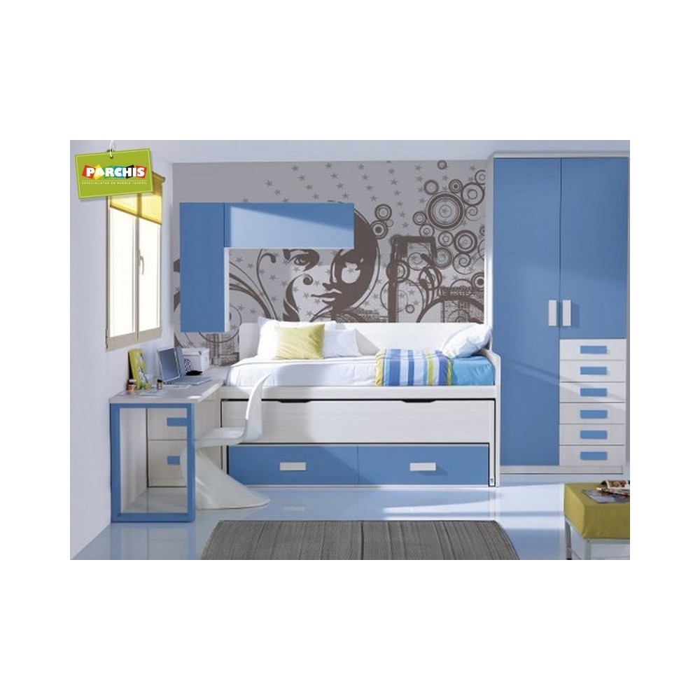 Combinación en tonos blancos y azul pastel, conjunto de muebles infantiles con cama compacta doble, abajo tapada, y dos cajones.
