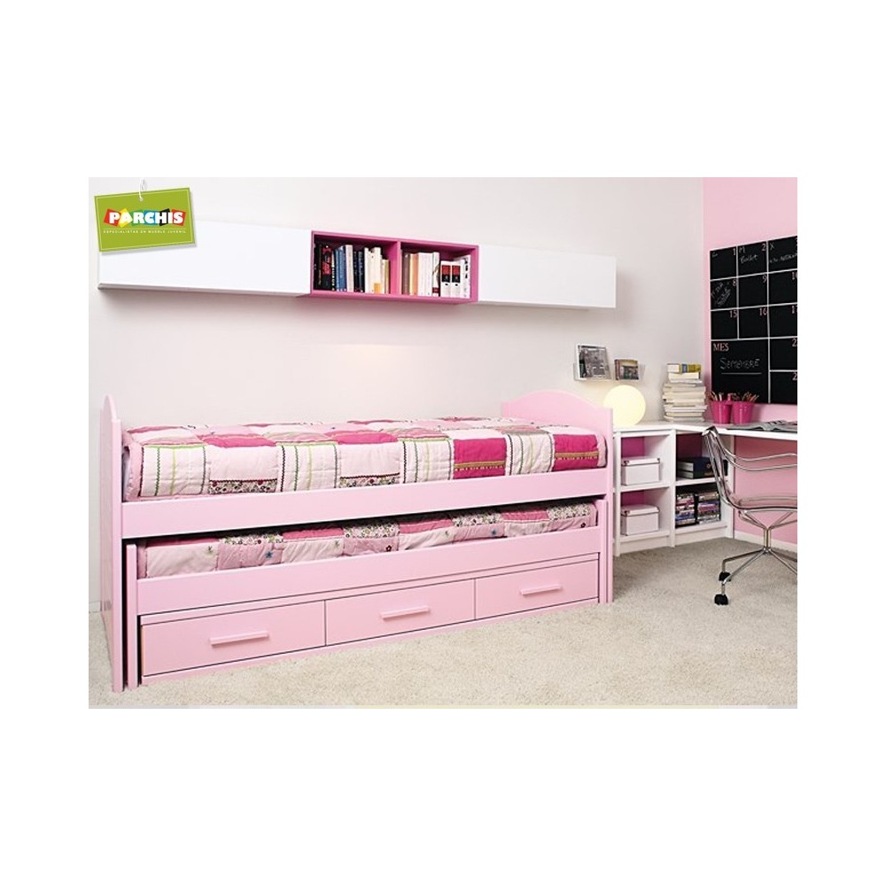 Mueble cama compacto, con dos camas, arriba cama fija abajo cama desplazable vista, sin tapar, y además con tres cajones.