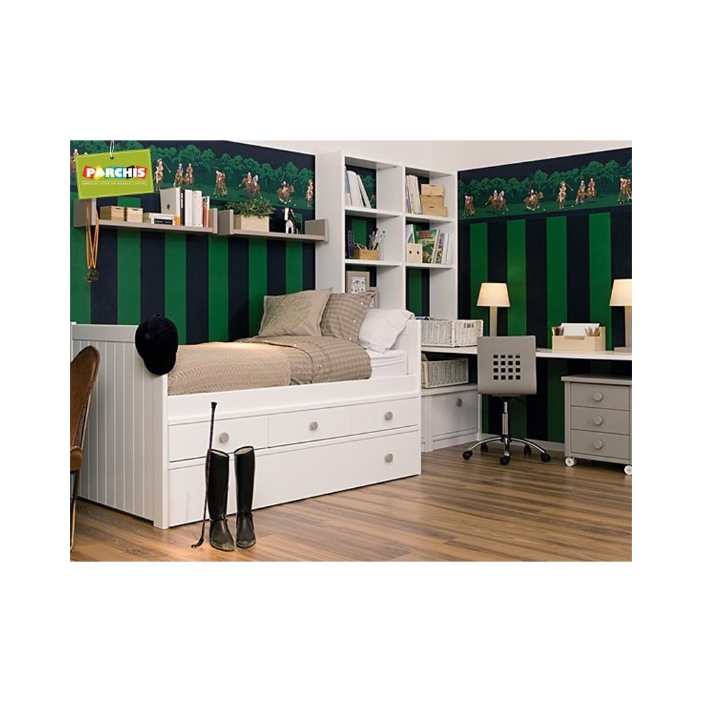 Mueble cama compacto, con una cama alta y costados a casi un metro de altura, una cama baja de arrastre y unos cajones centrales.