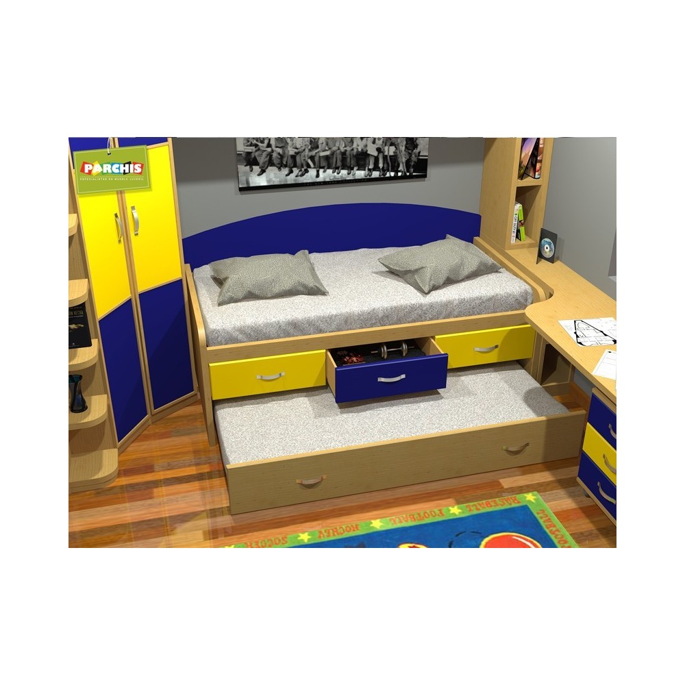 Mueble cama compacto, con cama alta, tres cajones centrales en el medio y otra cama desplazable abajo.