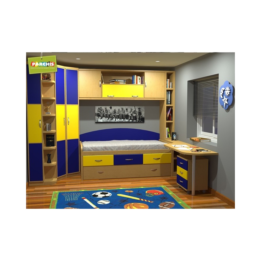 Dormitorio juvenil para adolescentes en colores vivos y alegres, para niño o niña en azul y amarillo. Con una zona de estudio a medida con módulos bajos de cajones y estantes.