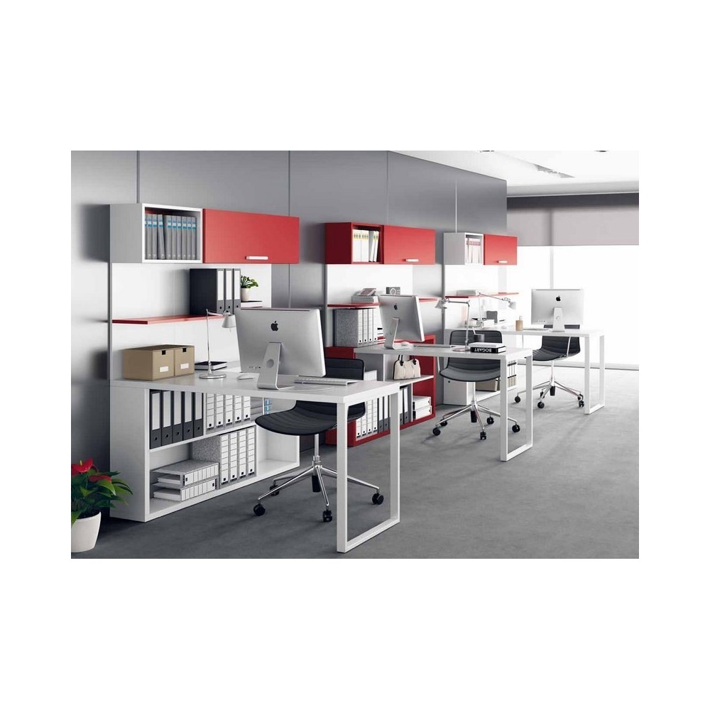 Con mesa en forma de rincón y de ancho 1,60mts. Por detrás una bonita combinación de librerías con muebles altos para almacenaje.