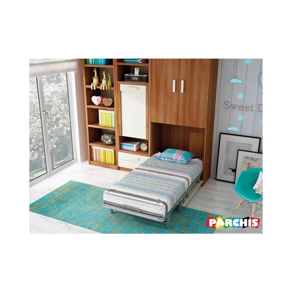 Con una cama plegable con armario de dos puertas arriba, opcional, se puede poner solo al cama, o librerias abiertas.