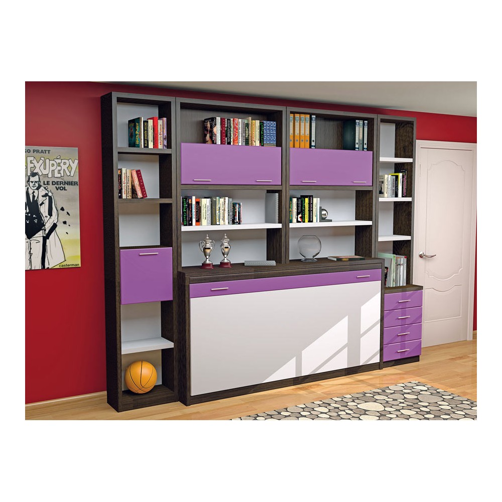Combinado en un color de madera clarita como base y morados claros y oscuros en sus frentes. Completando el dormitorio, unas librerias con cajones y puertas y una gran mesa de escritorio.