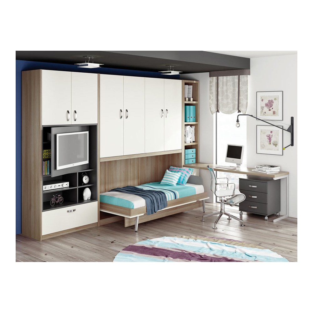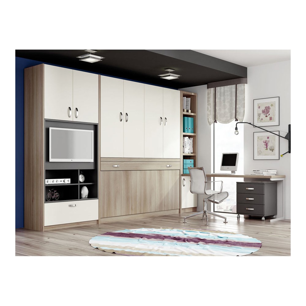 Bonito dormitorio con cama abatible horizontal de 90x190, con parte alta armarios de dos puertas, con altillo maletero y además estantes vistos con una buena distribución.