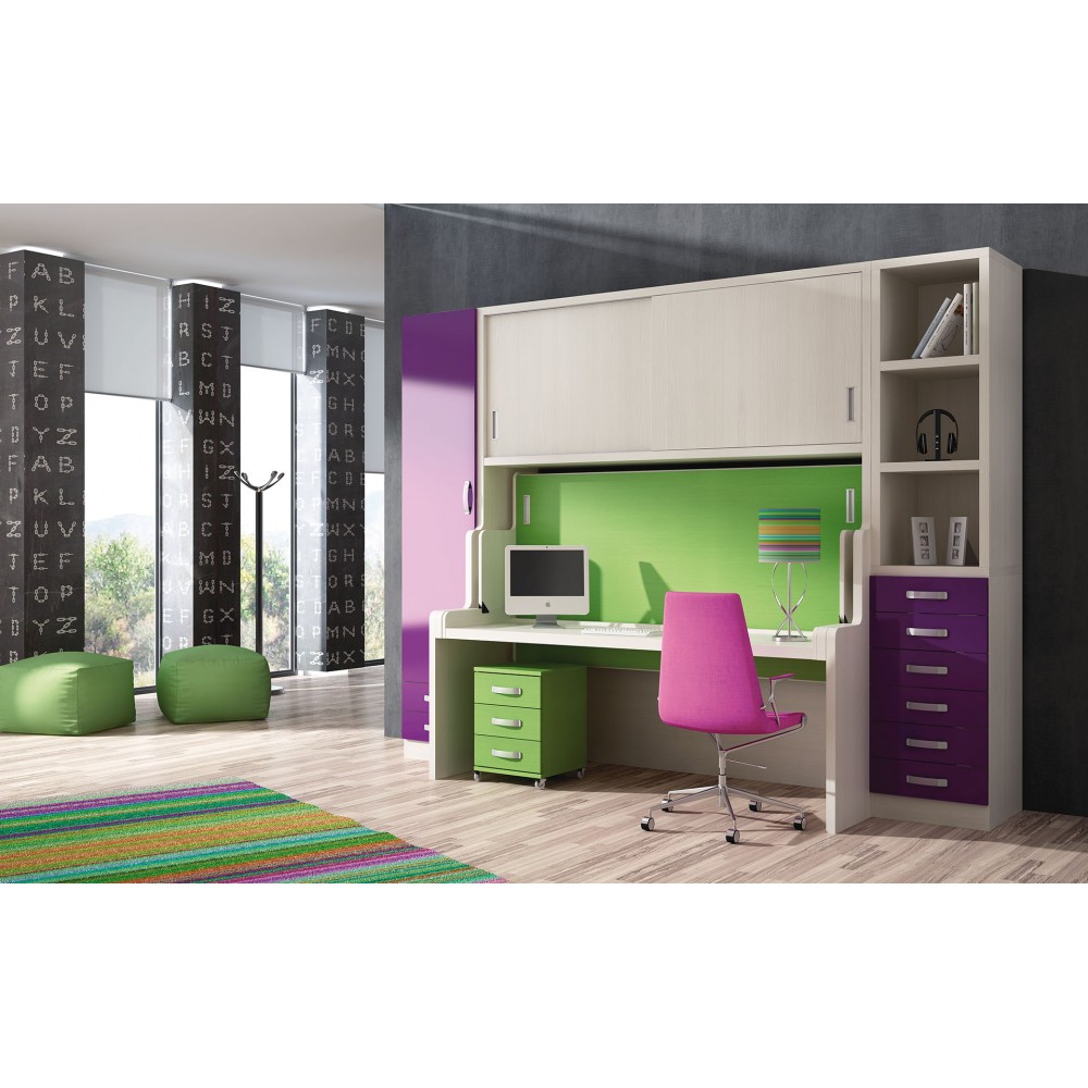 Este modelo con un simple giro aparece la mesa que queda debajo de la cama durante el día, además podrás completar el dormitorio con armarios laterales, puentes sobre la cama, estantes, cajones... según tu necesidad y cambiar los colores según te gusten.
